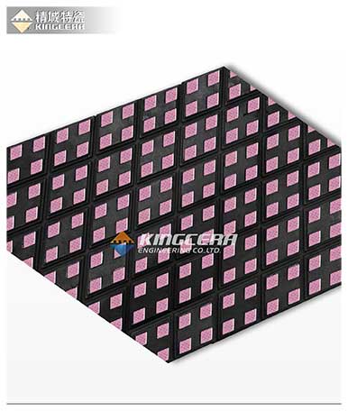 精城新一代滾筒陶瓷橡膠(NMC-B)是采用先進的熱硫化工藝將表面帶有顆粒的耐磨陶瓷按照一定的布局硫化在特種橡膠內,然后粘貼在滾筒表面以代替傳統的橡膠,起到增強皮帶與滾筒摩擦系數、提高滾筒使用壽命的作用。同時,每列陶瓷間的溝槽,便于排水排泥,在惡劣環境下保證正常運行。一般可延長滾筒使用壽命10倍以上。