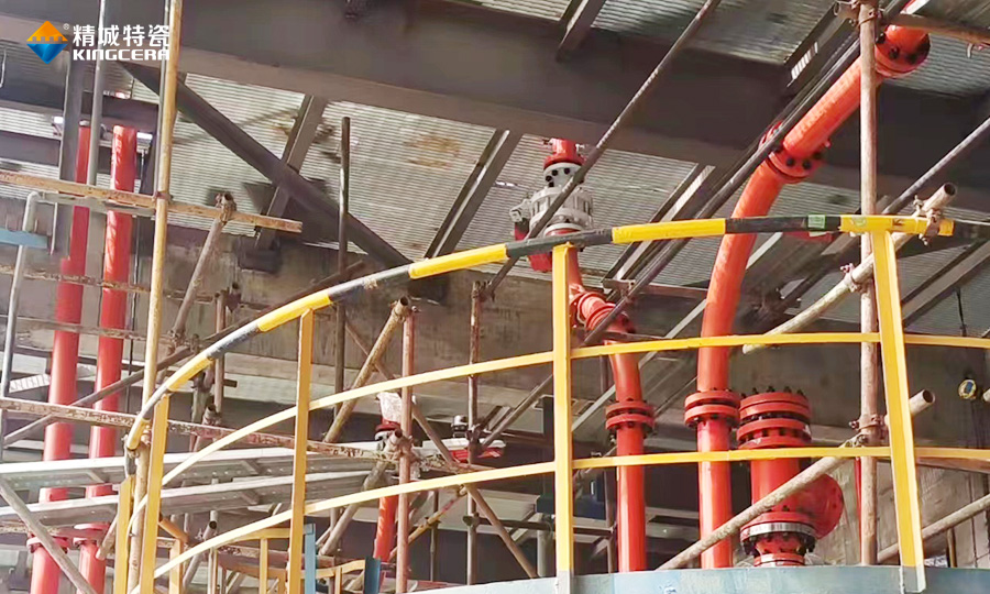 99氧化鋁陶瓷硬度超過HRA85,防磨能力出色,精城又以高溫陶瓷膠粘貼安裝。精城的高溫陶瓷膠可以在350℃的高溫下保持粘性,可以保障該冷氫化輸送管道平穩運行。為了減少拼接縫隙進一步提升管道防磨能力和密封性,精城使用了陶瓷環與整體成型陶瓷管相結合的結構。根據客戶需求和工況量身打造防磨方案,并派人前往現場指導安裝。精城的服務和產品質量都得到客戶高度認可。