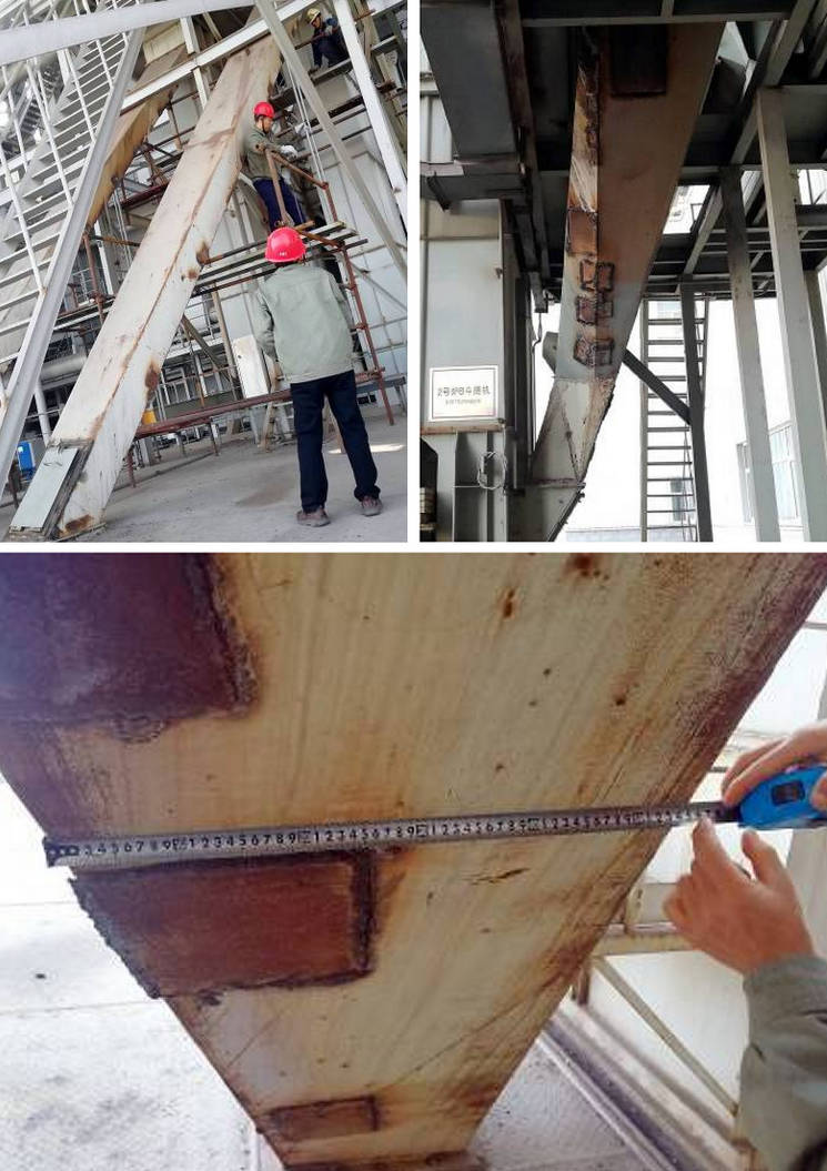 如圖所示,這個下料溜槽磨損嚴(yán)重,以前采用的8mm厚的普通鋼板,不到1年就磨穿了。高度近7米,斜面長近9米,落差高,顆粒大,爐渣內(nèi)有10mm左右的大顆粒,因為原煤里有煤矸石沒有被完全燃燒,所以造成溜槽底側(cè)嚴(yán)重漏粉,經(jīng)常被磨穿。了解到這些情況后,湖南精城特種陶瓷有限公司的技術(shù)專家結(jié)合現(xiàn)場的工況,給出了解決方案,整體分段制作溜槽,在每段流槽的磨損面粘貼精城牌大塊厚瓷(NMC-G耐磨陶瓷),各段之間采用法蘭連接,此方案經(jīng)濟(jì)又環(huán)保,使用壽命在6年以上。